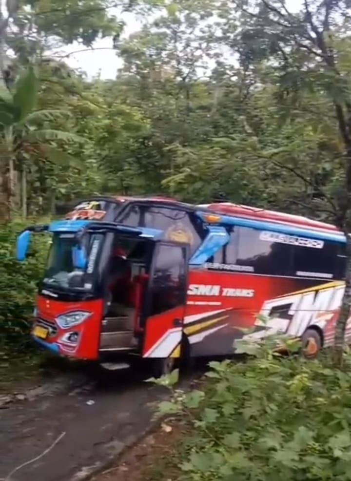 “Jalannya sempit, menanjak, dan licin karena hujan. Untuk kendaraan kecil masih bisa lewat, tapi bus besar jelas berisiko,” terangnya.