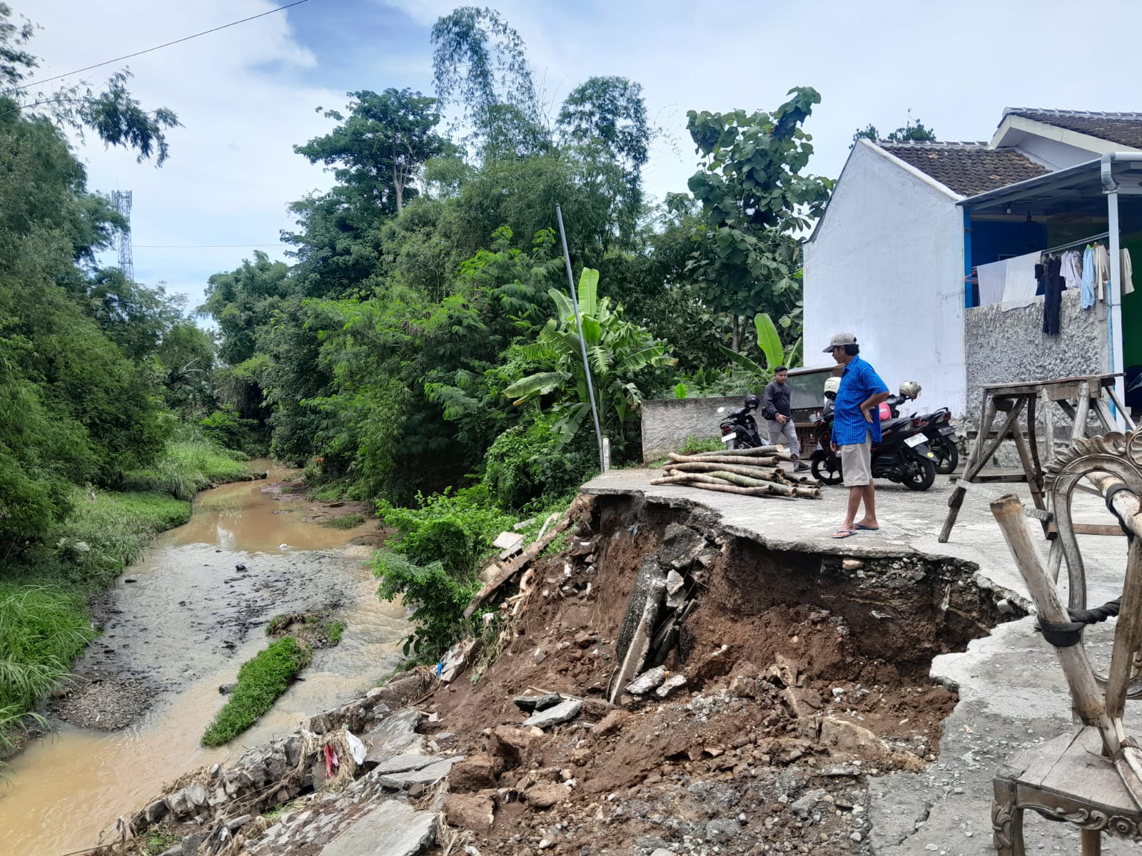 “Pas Jumatan hujan deras, tiba-tiba tanah bergetar lalu tanggul ambruk. Kebetulan ada mobil yang parkir hampir terjun, tapi bisa diselamatkan warga. Ban kirinya sudah ambles, tapi masih tertolong,” jelasnya.