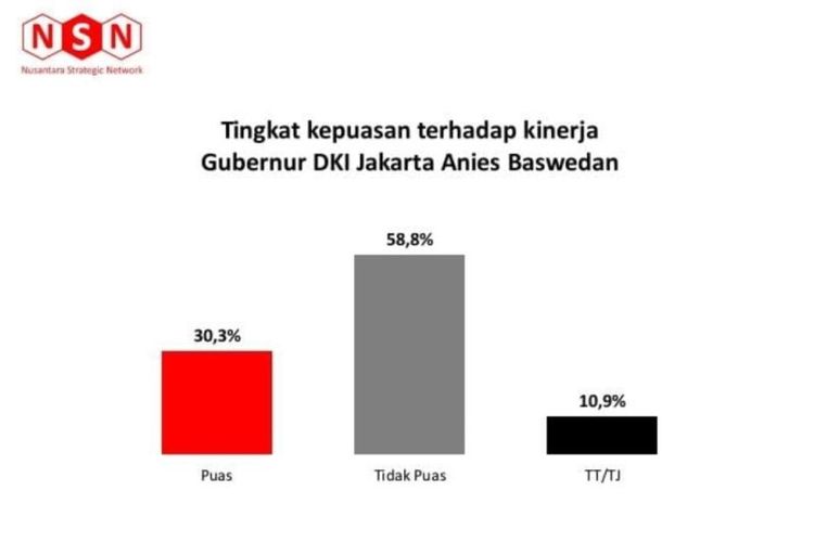 Berdasarkan hasil survei NSN, sebanyak 58,8 persen responden merasa tidak puas terhadap kinerja Anies dan sisanya tidak tahu/tidak jawab sebanyak 10,9 persen.
