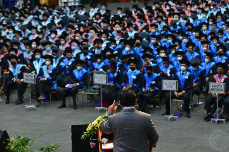 Prabowo menyampaikan orasi ilmiahnya di depan para Wisudawan Universitas Pancasila, Selasa (7/6). Dalam kesempatan itu, ia mengatakan mendapat waktu 20 menit untuk berbicara.